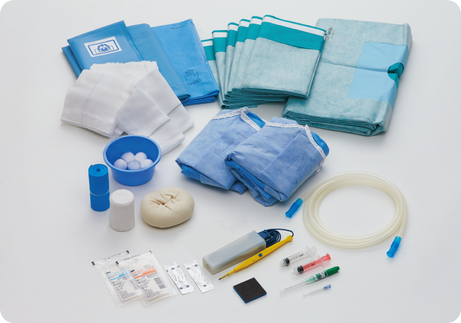 医療機器や不織布製品類など、手術では数多くのディスポーザブル(使い捨て)医療材料が必要となります。それをあらかじめ1つにパッケージしたものが手術準備用キットです。