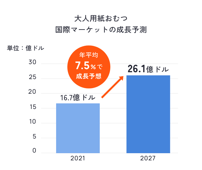世界の大人用紙おむつの市場規模は、2021年から2027年の7年間の間で、年平均で7.5%成長すると予測されています。