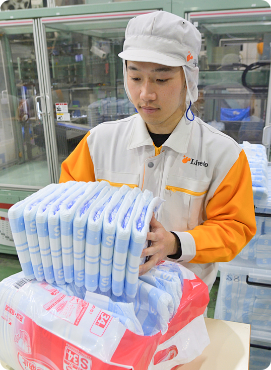 品質管理課はさまざまな部門の社員と連携をとり、一定水準以上の品質が保てるよう生産ライン全体をコントロールする部署。具体的には製品の品質検査を行うのですが、紙おむつがきちんと吸水しているか、寸法がずれていないか、強度は適切かなどをチェックしています。検査にはセンサーやカメラも使っていますが、中には問題のある製品がその網を潜り抜けて出てきてしまうこともあります。それをゼロにすることが私たちの目標です。製造工程で発生した不具合はもちろん、お客様から寄せられた意見については、部署を横断して原因究明や再発防止のための改善に取り組みます。私はパッドタイプ(インナーの一種)とパンツタイプ(アウターの一種)の生産ラインを担当していますが、自社製品のブランドイメージを守る最後の砦でもあるので、常に安定して高品質な製品をお客様にお届けできるよう業務に向き合っています。そのために欠かせないのはコミュニケーション。業務上、こちらからお願いするパターンが多いので、人との繋がりを大切にしています。