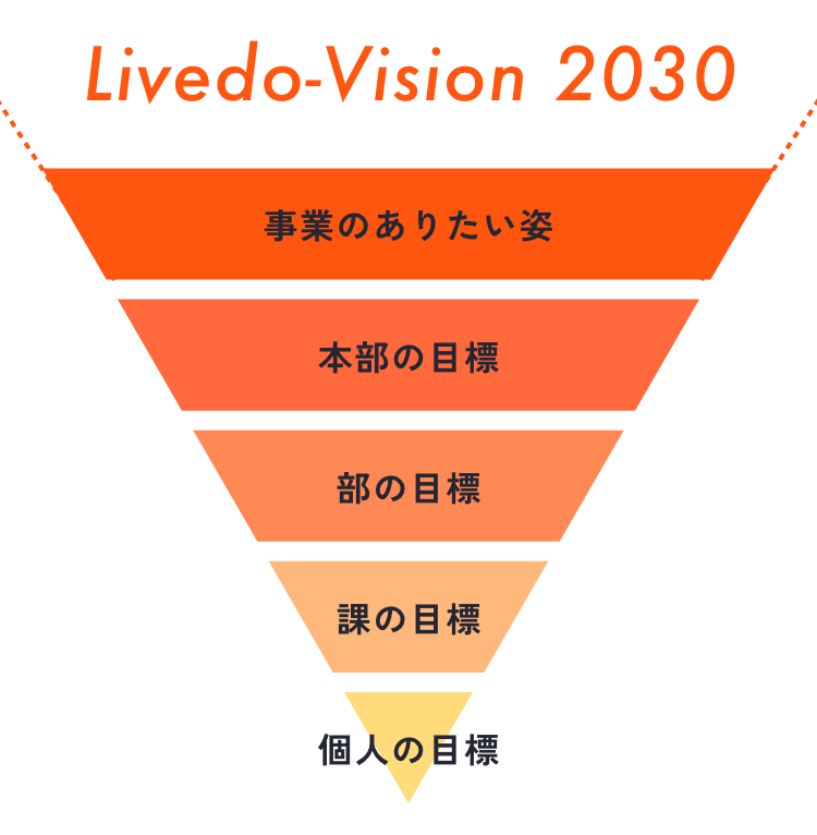 それぞれの事業のありたい姿に対して本部・部・課の目標があり、それに対して半期ごとに個人の目標を設定。